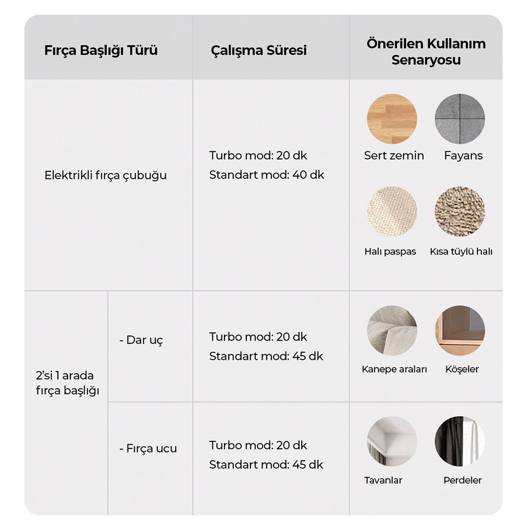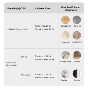 Kullanım Süresi: 20 dk (Turbo), 40 dk (Standart)