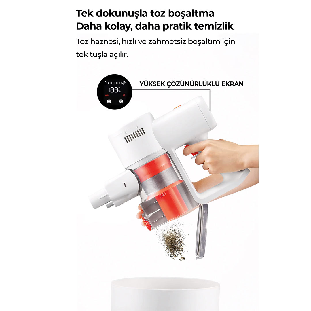 Kirli hazneye dokunmadan, tek bir tuşla toz boşaltma kolaylığı. Daha hijyenik, daha pratik.