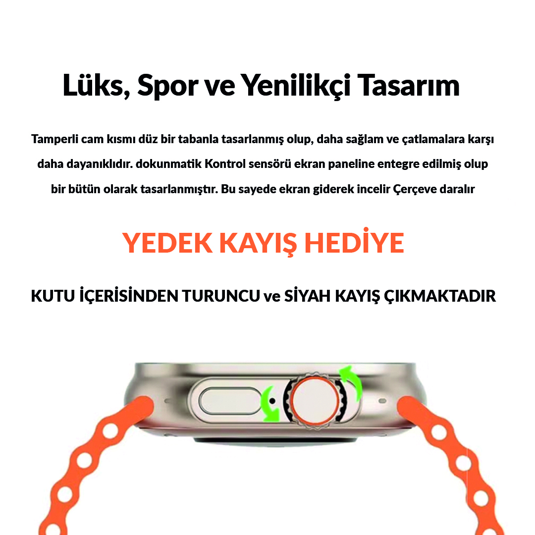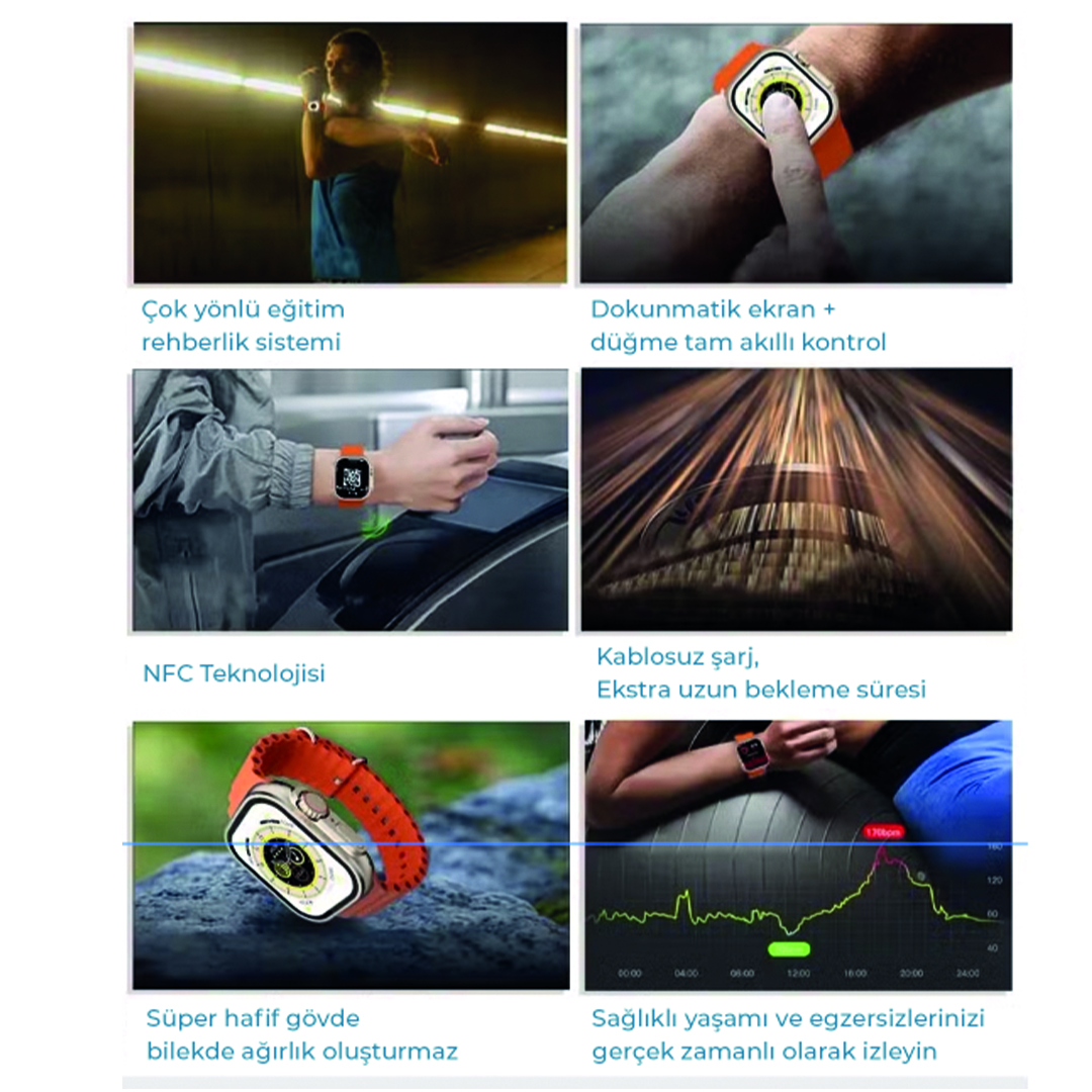Hiking WH8 Akıllı Saat; geniş 1,96” dokunmatik ekranı, Bluetooth ile telefon görüşmesi özelliği, kalp atış hızı, tansiyon ve SpO₂ takibi gibi sağlık fonksiyonları, spor modları ve akıllı bildirim desteğiyle günlük hayatınızı kolaylaştıran şık ve çok yönlü bir akıllı asistandır.