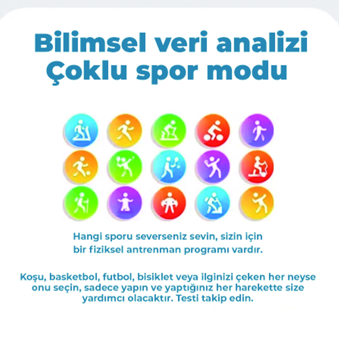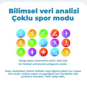 Özelleştirilebilir spor modları: Koşu, yürüyüş, bisiklet, triatlon, okçuluk, pilates gibi en az 6 farklı spor modu ile aktivite verilerini detaylı takip eder.