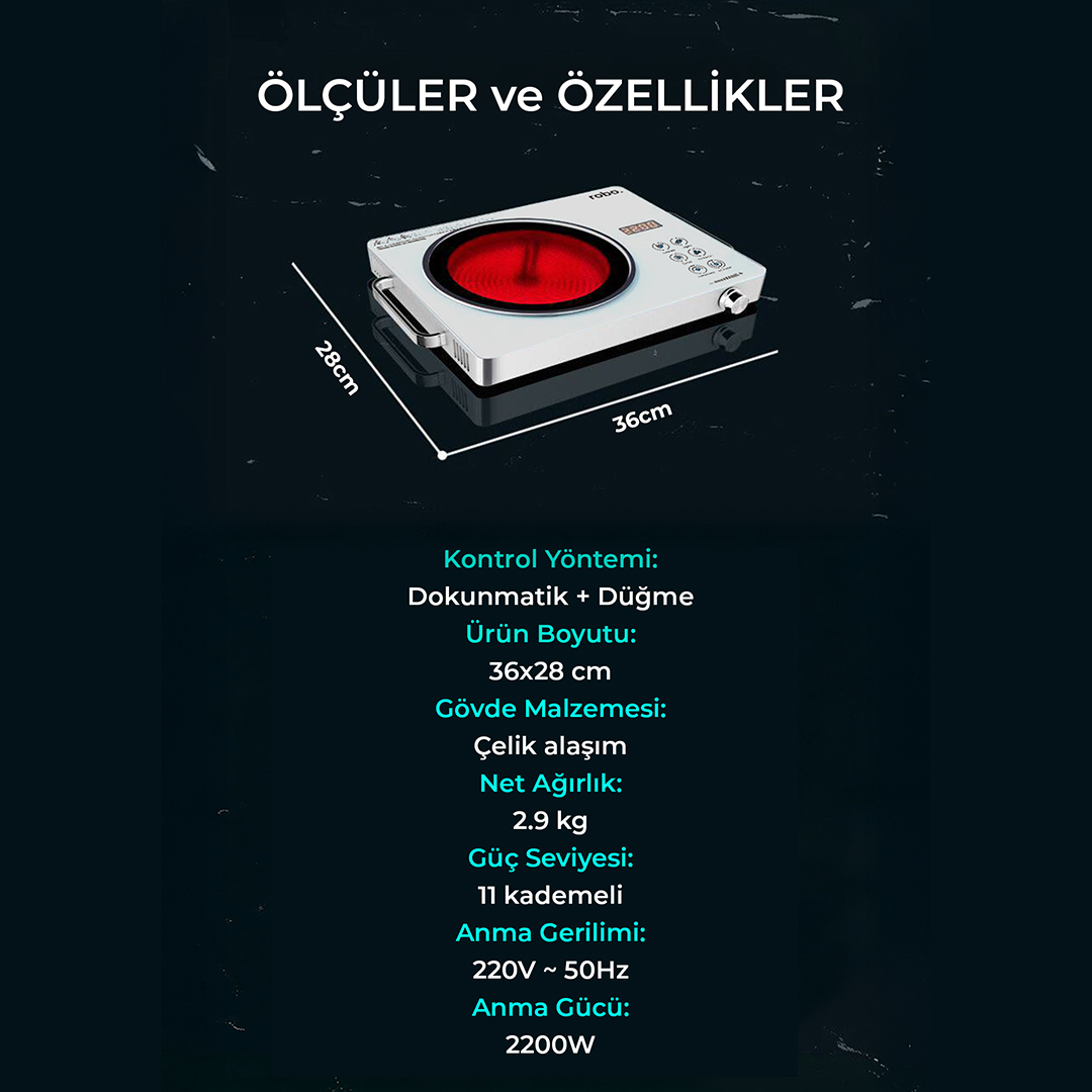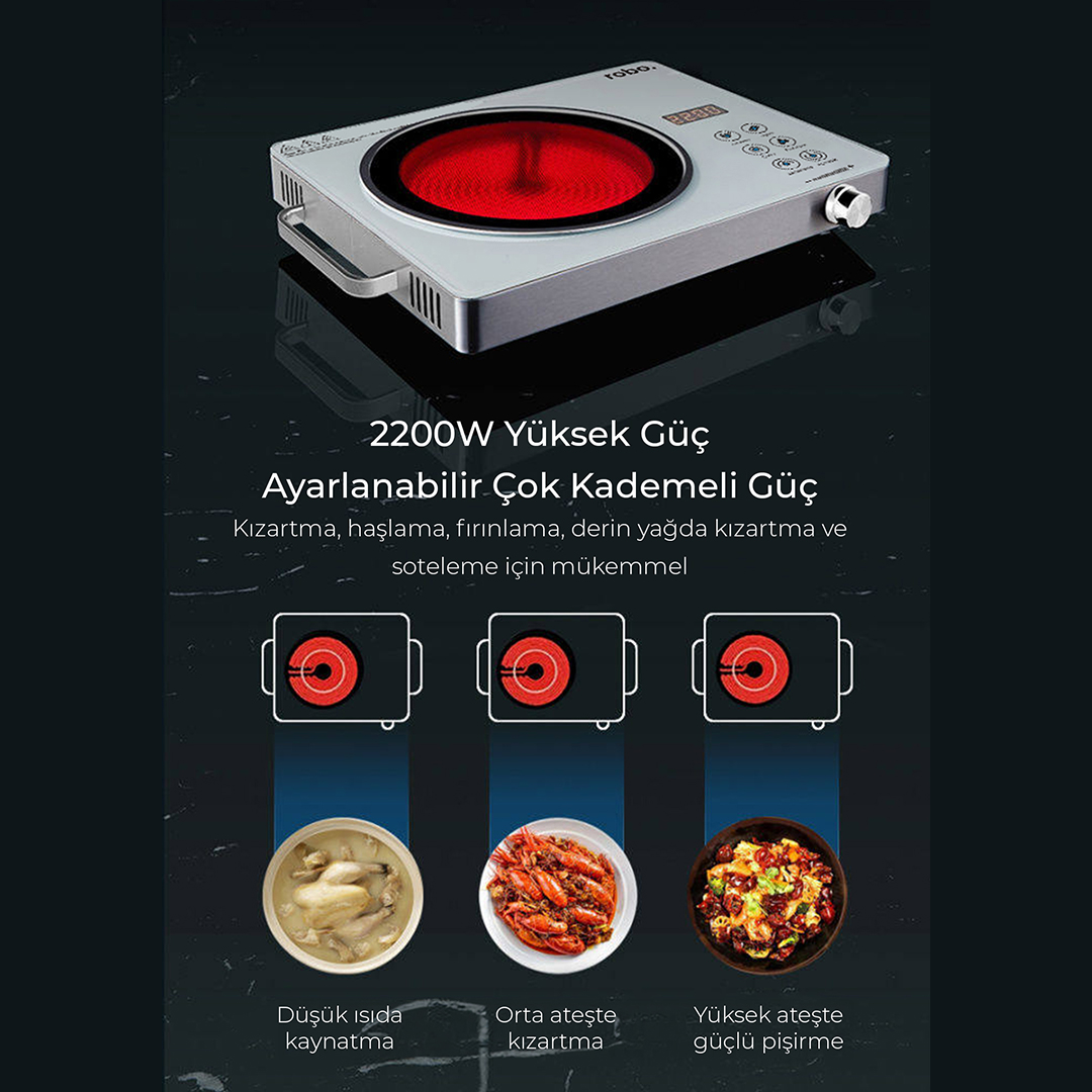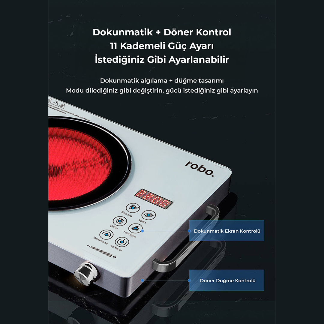 robo Dokunmatik Tekli Elektrikli Ocak 2200W yüksek güç, tüm ısıya dayanıklı tencerelerle uyumlu kullanım, dokunmatik ekran ve döner düğme ile kolay kontrol, 0–240 dakika zamanlayıcı ve kompakt taşınabilir yapı sayesinde günlük yemek hazırlığını çok daha pratik hale getirir.