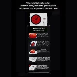robo beyaz tekli elektrikli ocak, modern kullanım deneyimi sunan dokunmatik ekran ve döner düğme kombinasyonu ile tasarlanmıştır. Bu yapı sayesinde ayarları daha pratik şekilde yapabilir, güç ve sıcaklık seviyesini dijital ekran üzerinden rahatça takip edebilirsiniz.