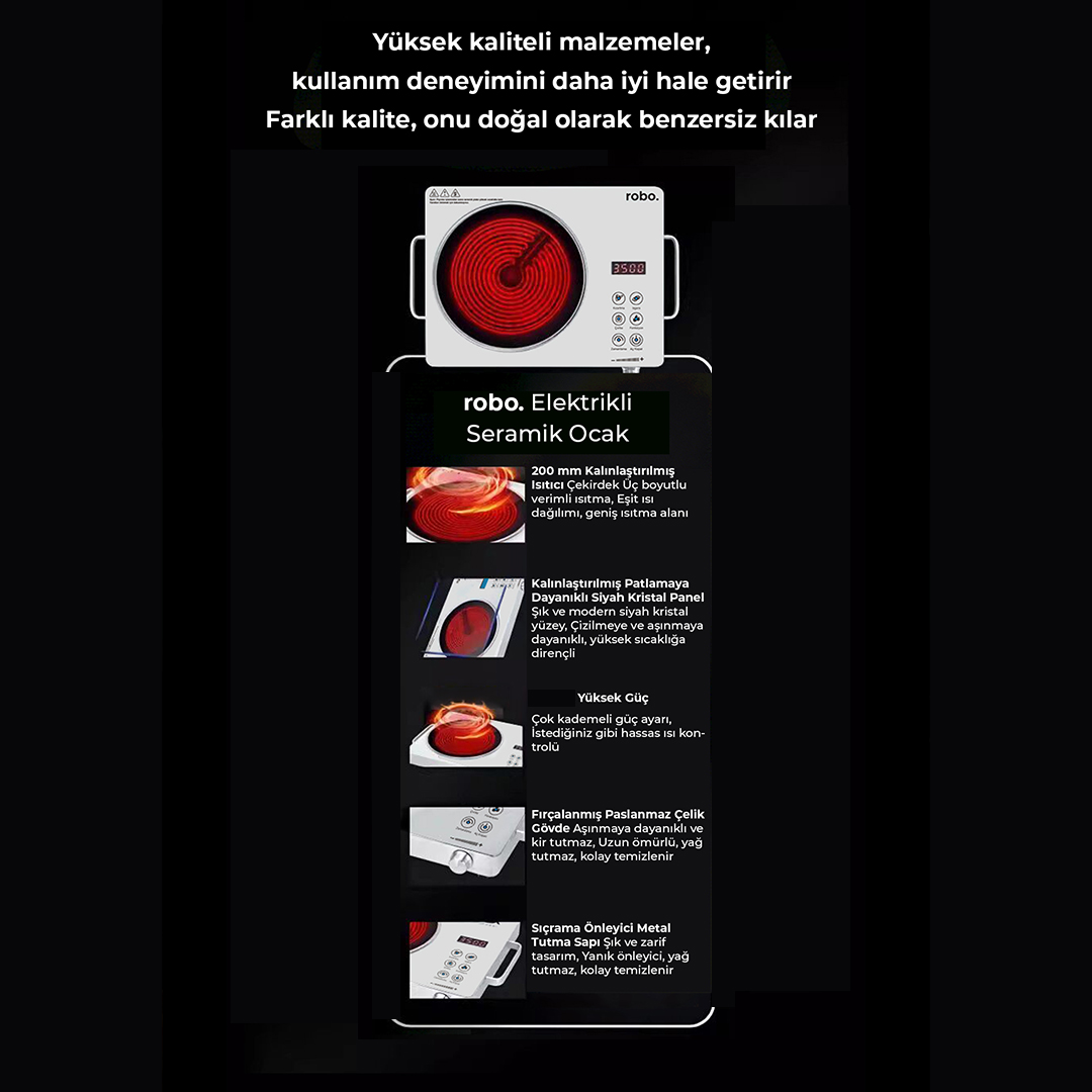 robo 2200W Dijital Dokunmatik Tekli Elektrikli Ocak Beyaz, az yer kaplayan yapısı, şık görünümü ve güçlü performansıyla günlük mutfak ihtiyaçlarını pratik şekilde karşılamak isteyenler için ideal bir tercihtir. Özellikle küçük mutfaklar, ek pişirme alanı ihtiyacı olan evler, ofis kullanımı, yazlık yaşamı ve karavan düzeni için işlevsel bir çözüm sunar.