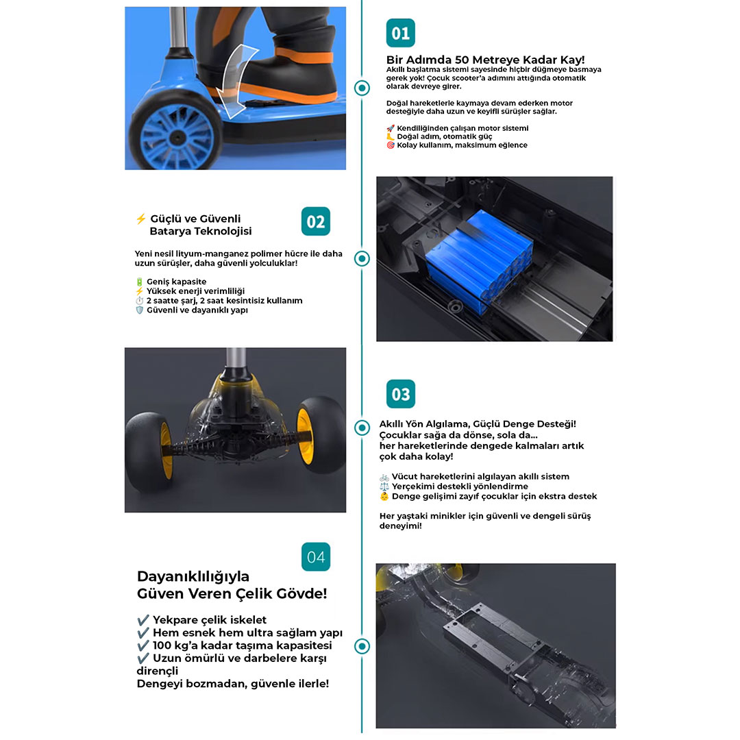 ✅ Işıklı Ön Tekerlekler: Gece ve gündüz sürüşlerini eğlenceli ve dikkat çekici hale getirir.