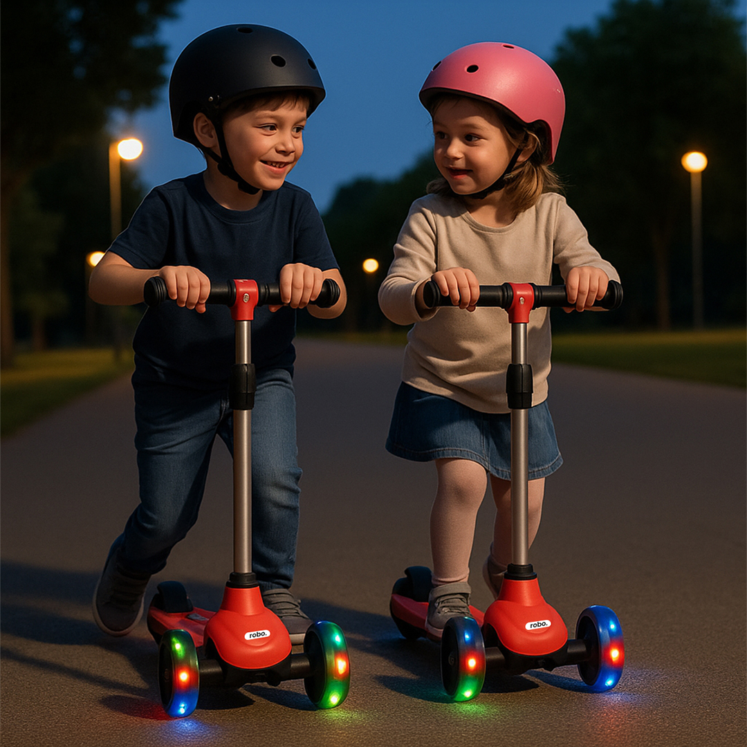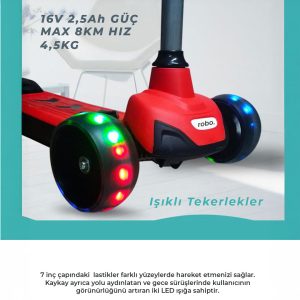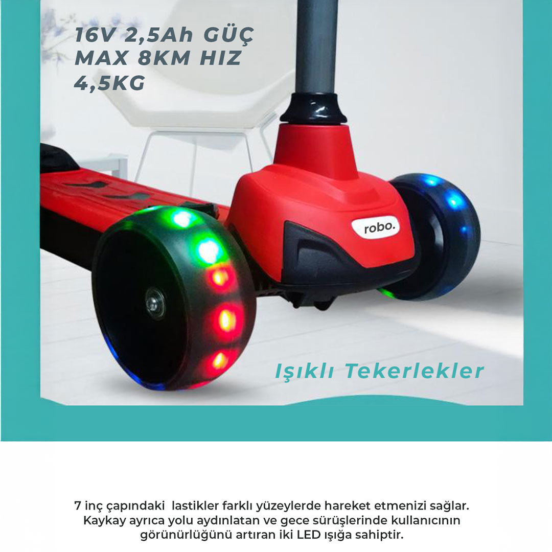 Çocuklar için özel olarak tasarlanmış Robo 3 Tekerlekli Çocuk Elektrikli Scooter, güvenli ve keyifli bir yolculuk sunar. Hem açık hava aktivitelerini teşvik eder hem de denge ve koordinasyon becerilerini geliştirir.