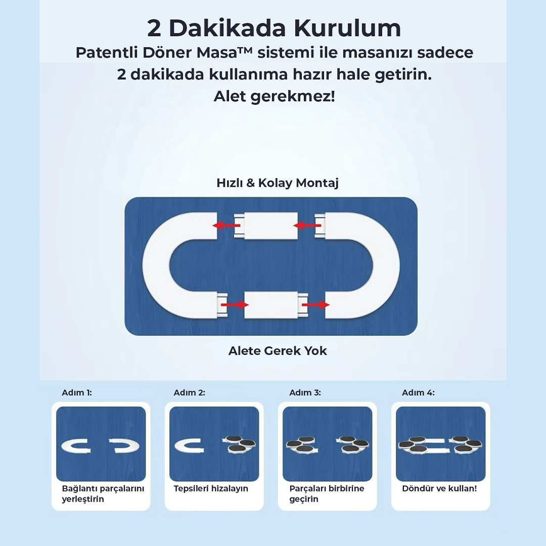 robo döner masa, özellikle kalabalık aile yemeklerinde, misafirli sofralarda ve uzun kahvaltı masalarında büyük rahatlık sunar. Sofrada düzeni artırır, servis sırasında sürekli kalkma ihtiyacını azaltır ve herkesin aynı anda servise erişmesini kolaylaştırır. Modern, şık ve fonksiyonel tasarımıyla hem ev kullanımı hem de profesyonel servis alanları için uygundur.