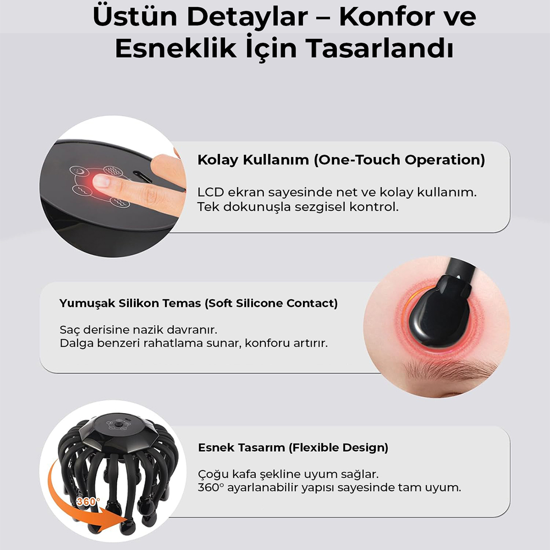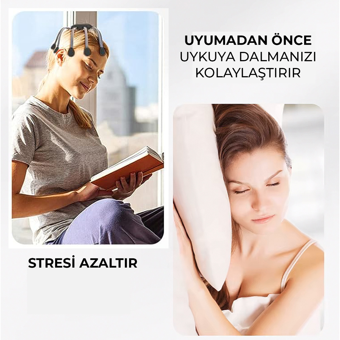 Bu yenilikçi masaj cihazı, kan dolaşımını artırarak kafa yorgunluğunu hafifletir, rahatlamanızı sağlar ve daha kaliteli bir uykuya yardımcı olur.