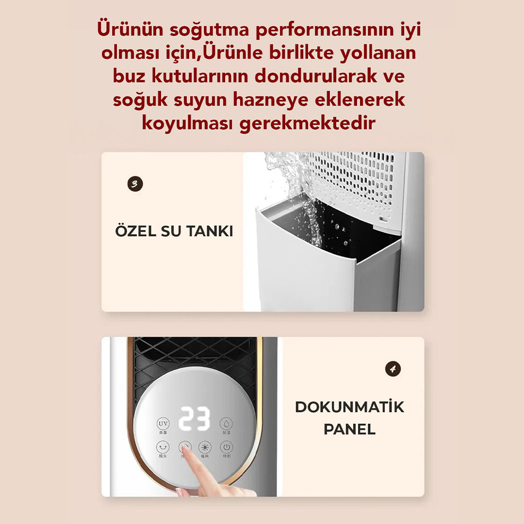 ürün gayet güzel. çalıştırdım. soğuk hava ve nemlendirme var. Su haznesine buz koydum. gayet iyi. bu fiyata çok iyi. sesi normal fandan daha az. klima değil tabi ama işe yarıyor. etrafına dönerek hava ve nem üflüyor. sadece iki buz aparatı yerine tek çıktı. bu bir eksi. fişe tak çalıştır. bence beşbin kusur bir rakama çok işlevsel.