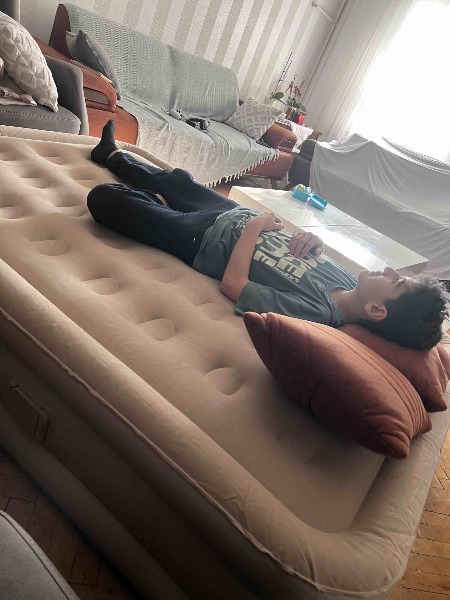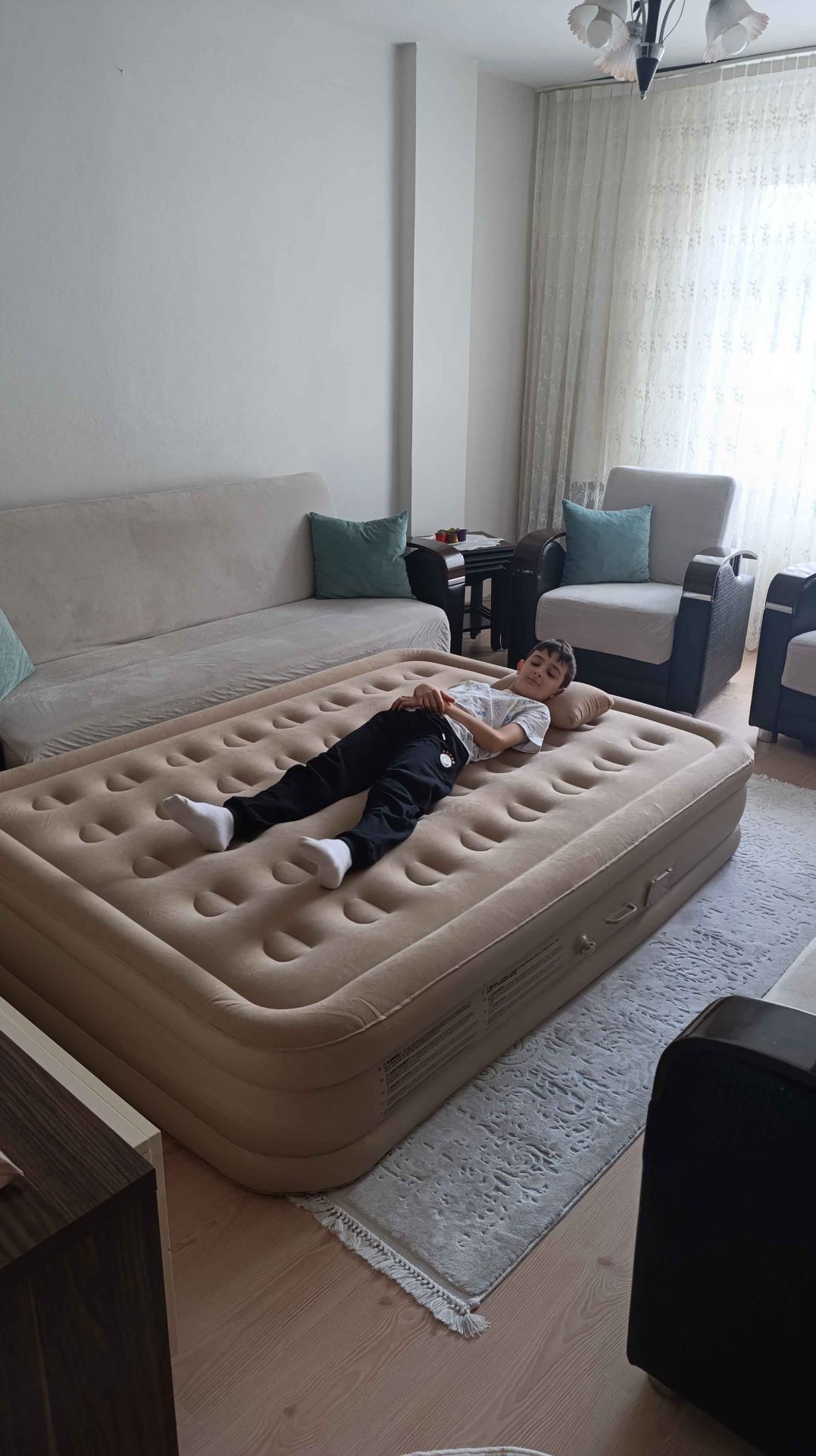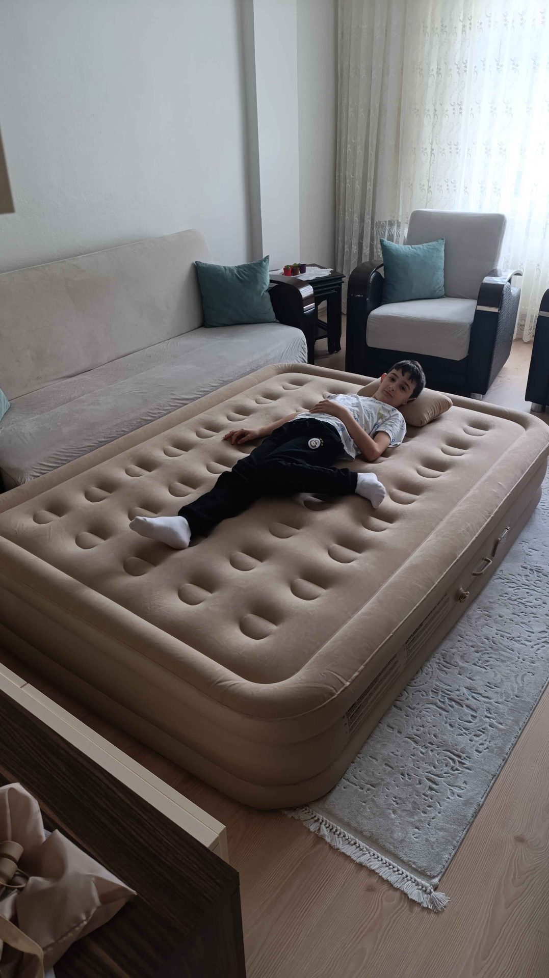 Dün geldi akşam çıkardık yatağı, çocuklar üstünde bayıla bayıla yattı. Yüzeyi yumuşacık, çarşaf bile sermeden kullanılıyor. Misafir ağırlarken kurtarıcı olur bu benden söylemesi.