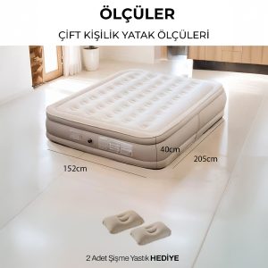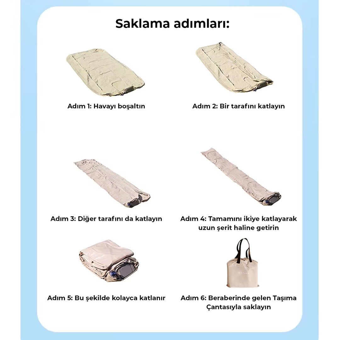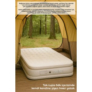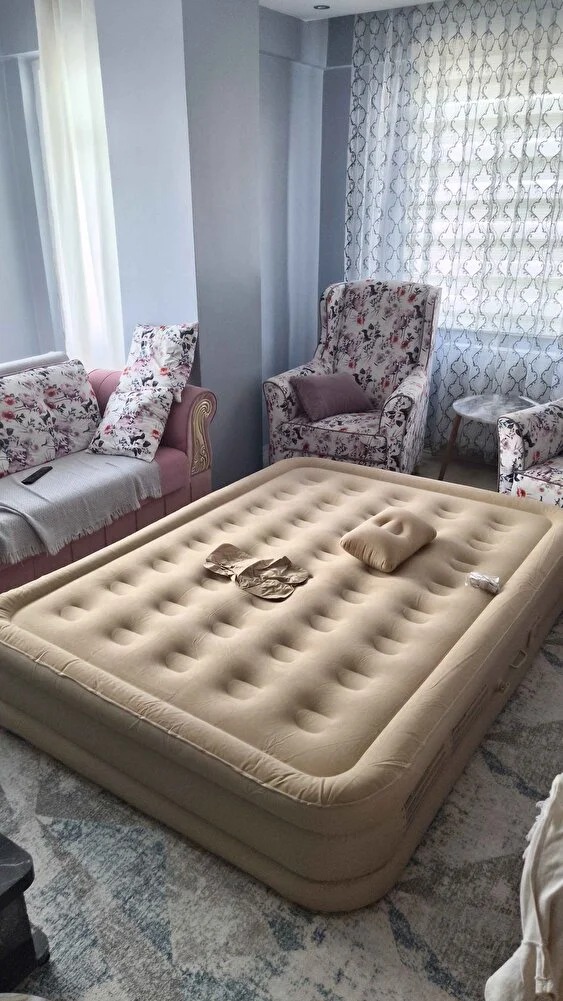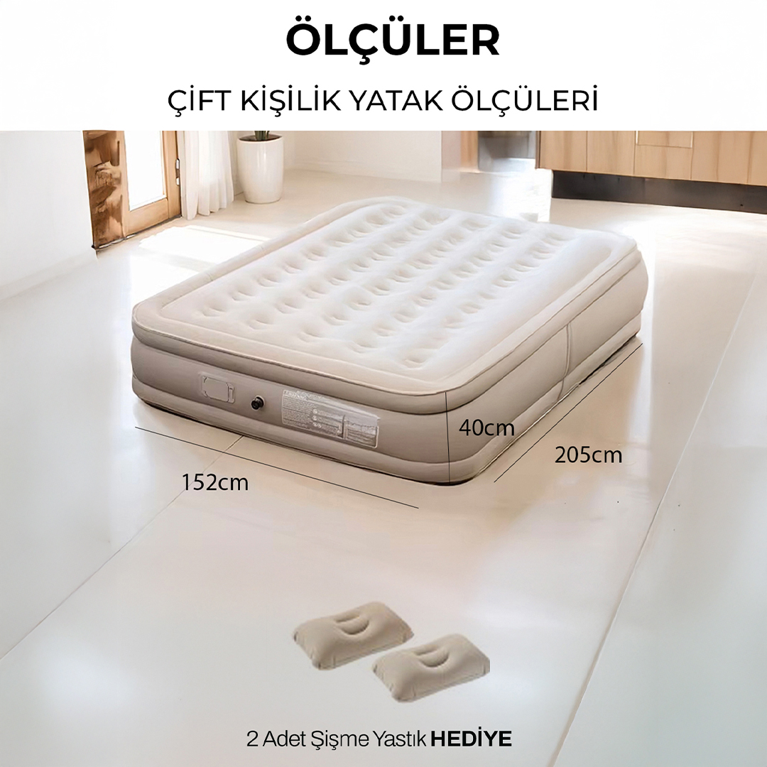 Uzun yolculuklarda, kamp gezilerinde ya da misafirleriniz için ekstra yatak arayışında artık zahmete gerek yok.Otomatik şişen çift Kişilik Şişme Yatak, yer kaplamayan tasarımı ve otomatik şişirme özelliğiyle her ortamda birkaç dakika içinde size yumuşacık bir uyku alanı sunar.