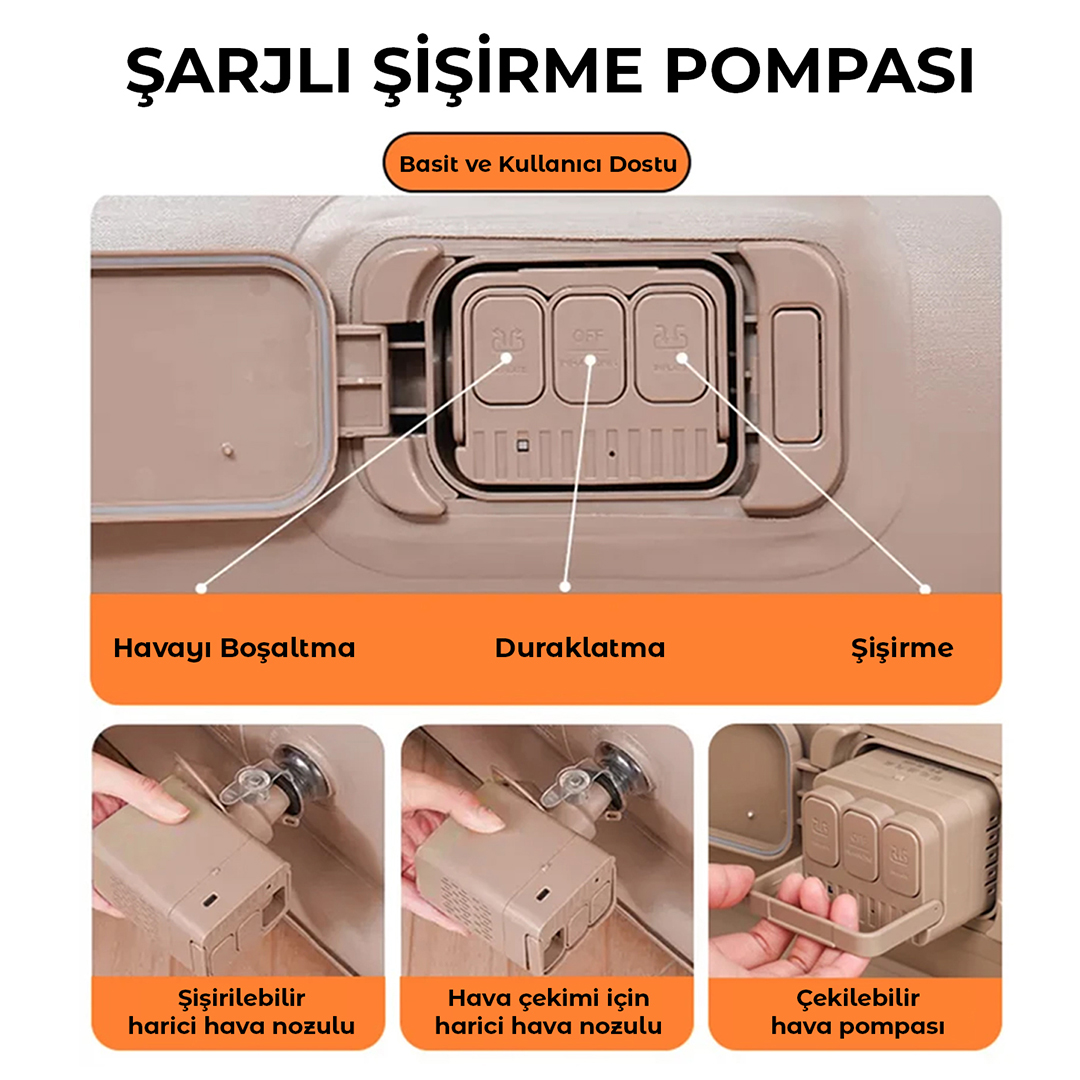 •Otomatik Şişirme Sistemi: Dahili pompa sayesinde yorulmadan kolayca tek tuşla şişirebilirsiniz