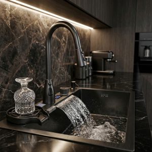 Minimalist çizgilere sahip siyah yüzeyi sayesinde mutfağınıza güçlü, modern ve premium bir görünüm kazandırır. Hem klasik hem çağdaş mutfak dekorasyonlarına uyum sağlayan bu tasarım, sadece işlevsellik değil görsel bütünlük de sunar.