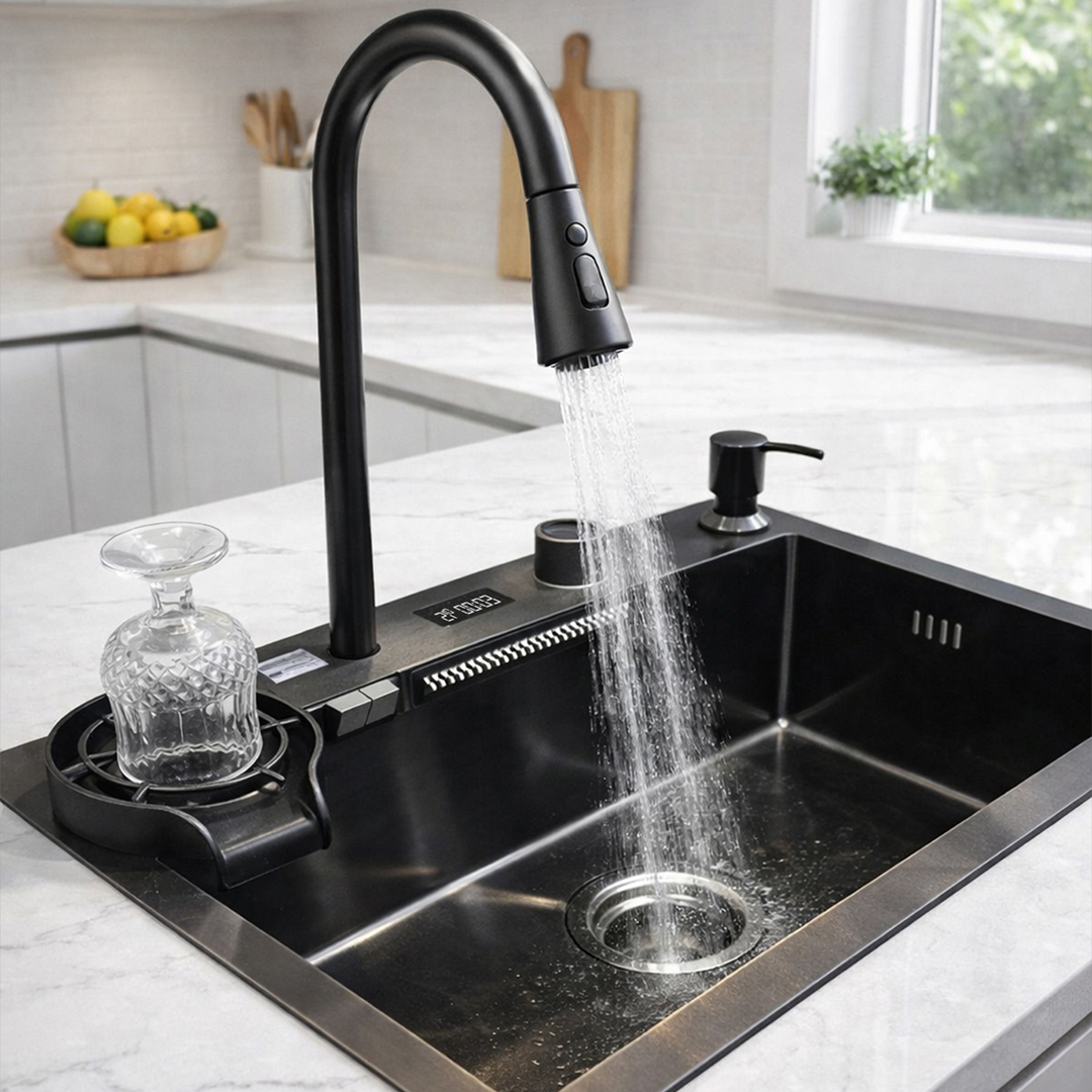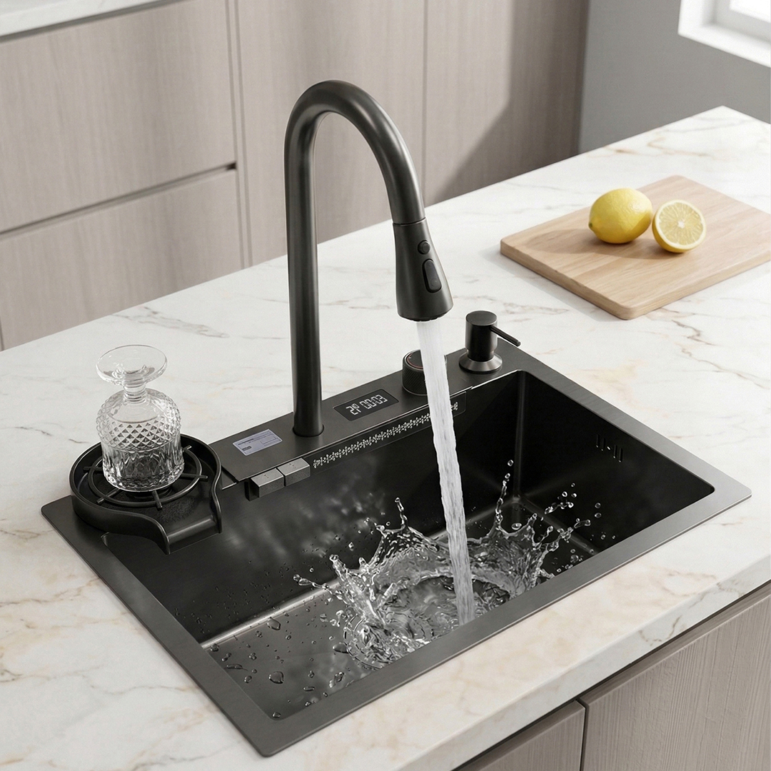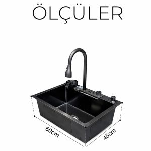 robo Dijital Akıllı Eviye Seti Siyah 60×45 cm, mutfağında hem estetik görünüm hem de fonksiyonel kullanım isteyenler için geliştirilmiş modern bir eviye setidir. Şık siyah tasarımı, dijital kontrol paneli, entegre bardak yıkama aparatı, çok fonksiyonlu batarya sistemi ve geniş haznesi sayesinde günlük mutfak işlerini daha konforlu, daha hijyenik ve daha pratik hale getirir. Bulaşık yıkama, sebze-meyve temizleme ve bardak içi yıkama gibi işlemleri tek noktada kolaylaştırarak mutfakta zaman kazandırır.