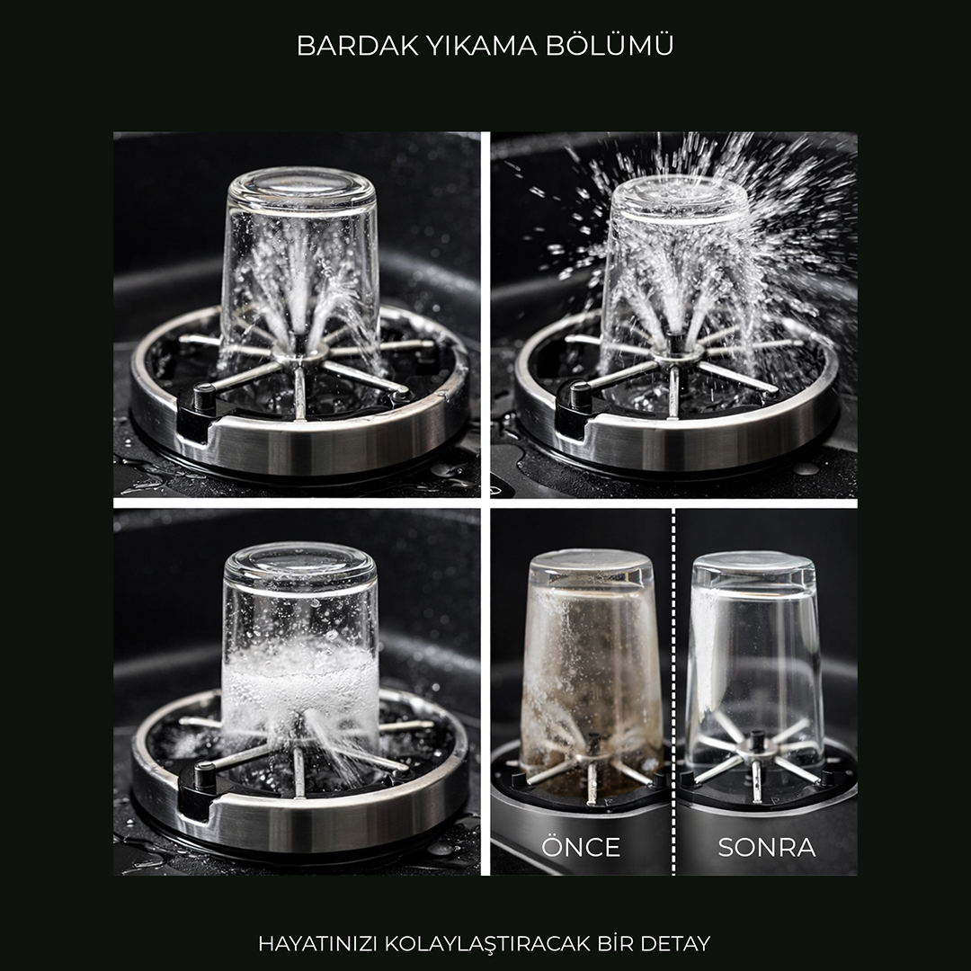 Entegre bardak yıkama aparatı ile hızlı ve hijyenik temizlik