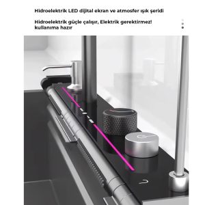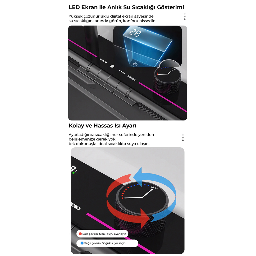 🔹 Dijital LED Ekran: Musluk üzerinde bulunan LED ekran sayesinde su sıcaklığını anında görüntüleyebilir ve sıcaklığı ayarlayabilirsiniz.