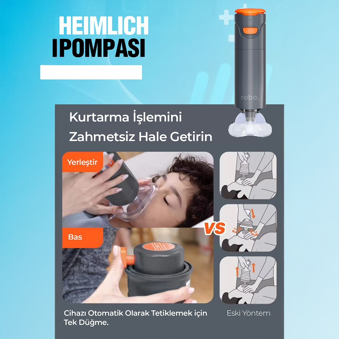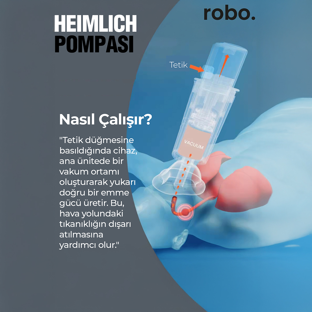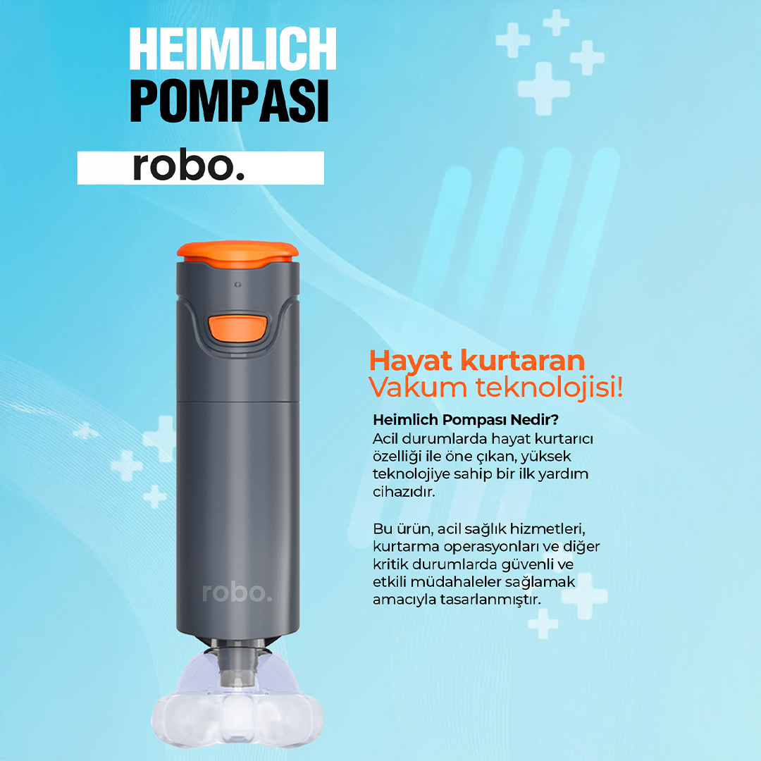 robo Heimlich Pompası (Hemlik Pompası) – Boğulma Önleyici İlk Yardım Cihazı, ani boğulma vakalarında hayat kurtaran yenilikçi bir ilk yardım cihazıdır. Soluk borusuna kaçan yiyecek veya yabancı cisimleri saniyeler içinde çıkarmak için tasarlanmıştır.