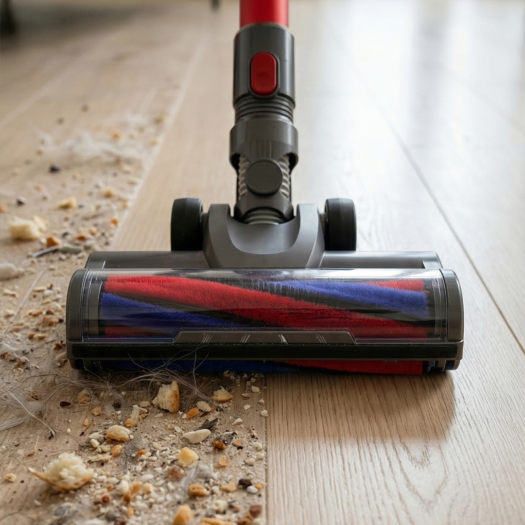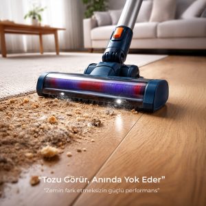 LED aydınlatmalı süpürge başlığı sayesinde yatak altı, koltuk kenarı ve dolap dipleri gibi karanlık alanlarda biriken tozları daha kolay fark edebilirsiniz. Böylece daha detaylı ve kontrollü temizlik yapabilirsiniz.
