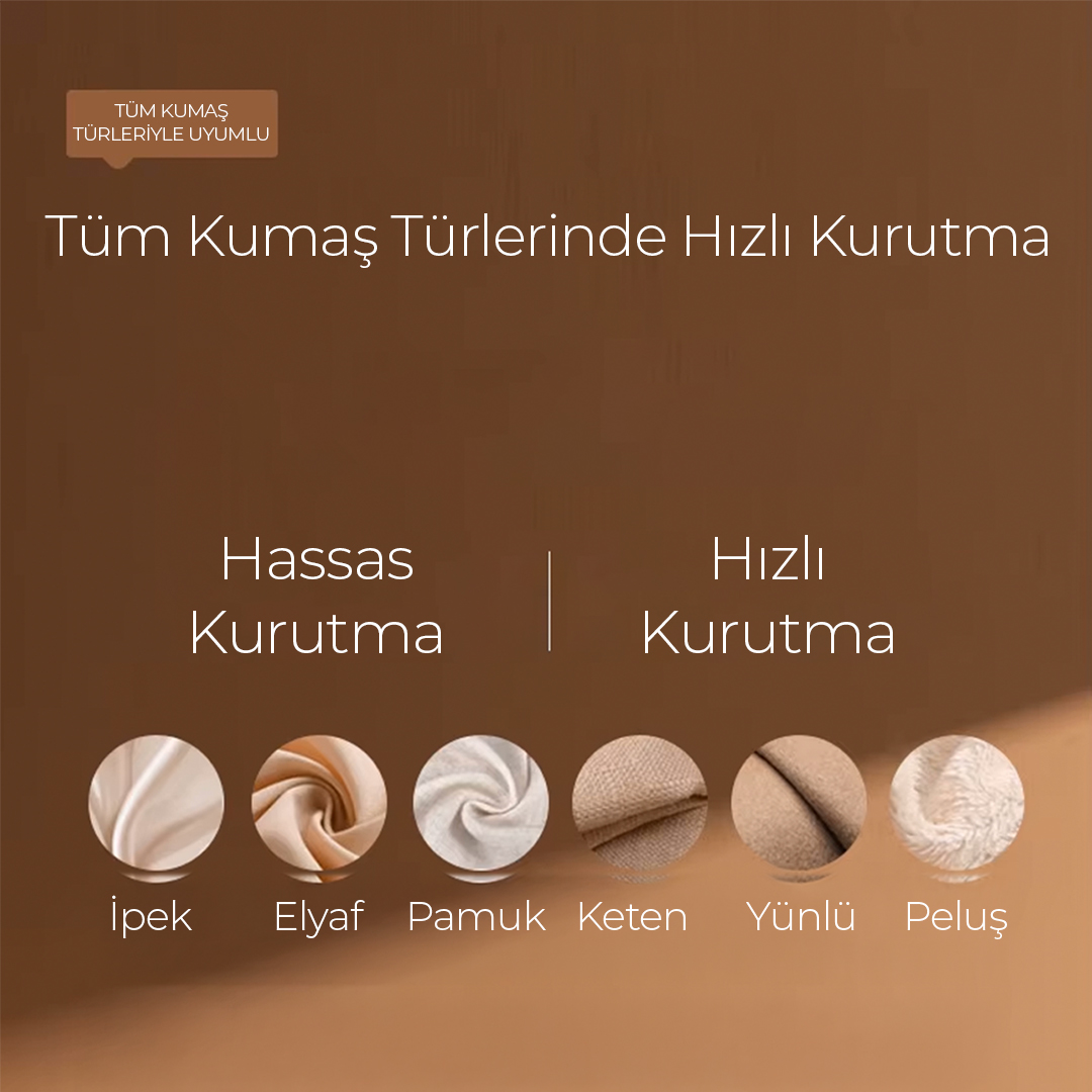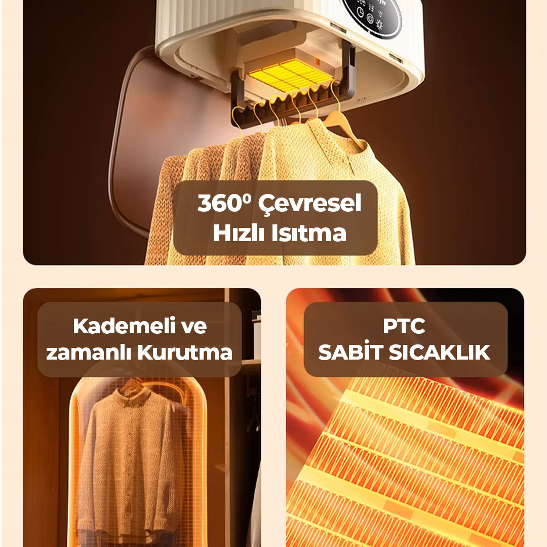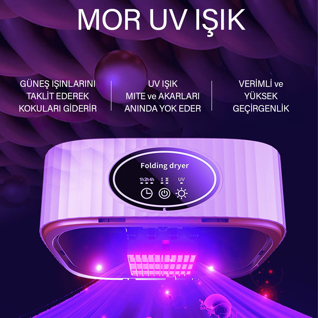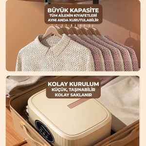 Katlanabilir tasarımı sayesinde az yer kaplar ve her an yanınızda! Üçlü sterilizasyon ile giysilerinizi yalnızca kurutmakla kalmaz, aynı zamanda korur. Kurutma Makinesi ile giysileriniz daima tertemiz ve şık görünsün!”