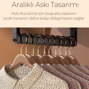 Mavi antibakteriyel UV ışık ve negatif iyon koku giderme teknolojisi sayesinde, kıyafetleriniz hem hijyenik hem de ferah bir şekilde kurur. Çift kademe ayarı ve yumuşak kurutma sistemi, giysilerinize zarar vermeden özenle kurutma sağlar.