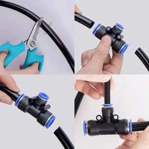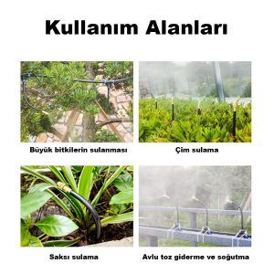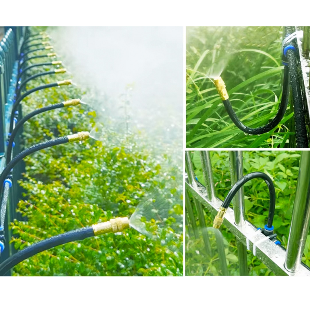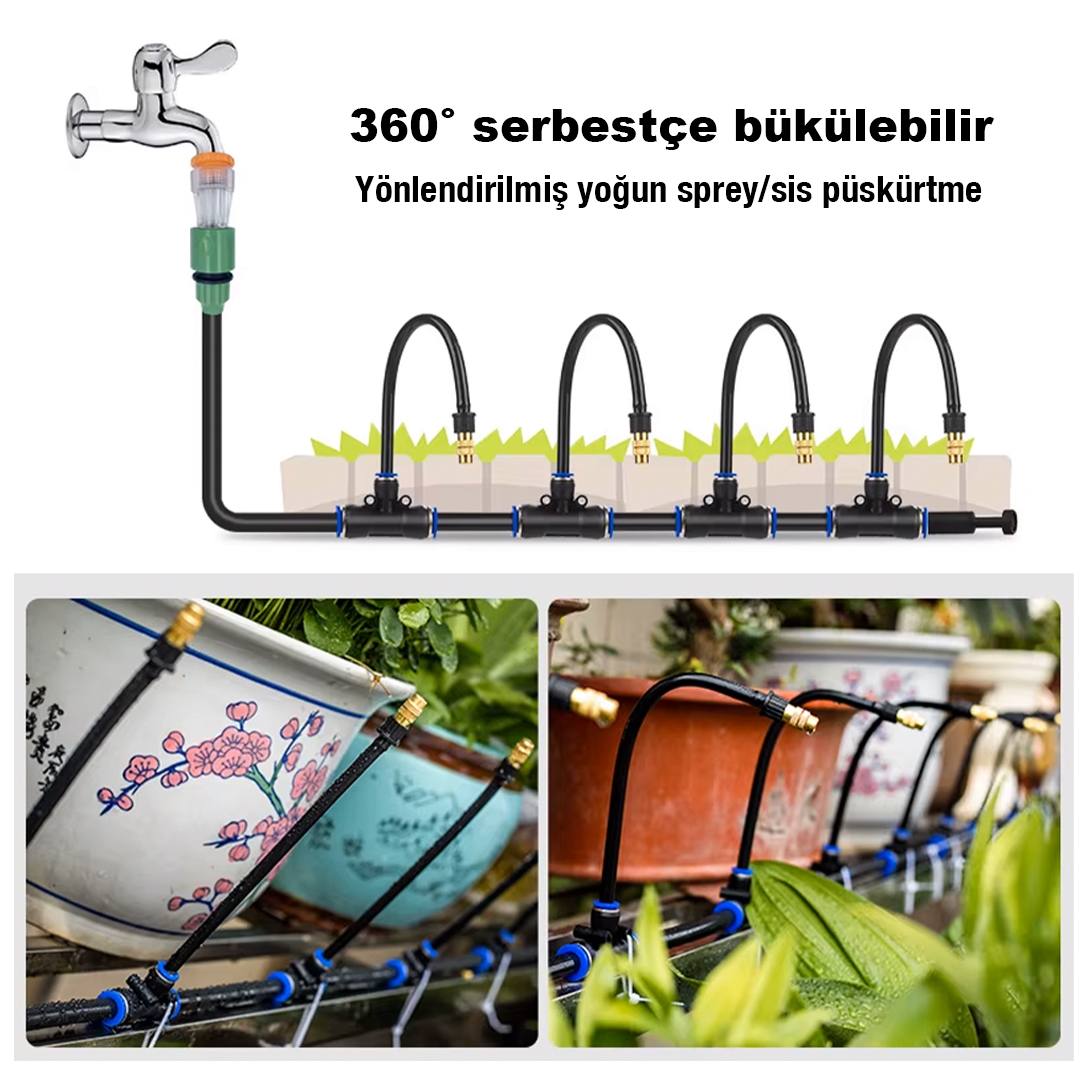 360° Ayarlanabilir otomatik sulama sistemi yüksek kaliteli pirinç başlıkları ve ayarlanabilir püskürtme açısıyla suyu ultra ince zerreciklere dönüştürerek ortamı serinletir, bitkilerinizi nemlendirir ve tozun bastırılmasına yardımcı olur. Enerji gerektirmez, yalnızca su basıncıyla çalışır.