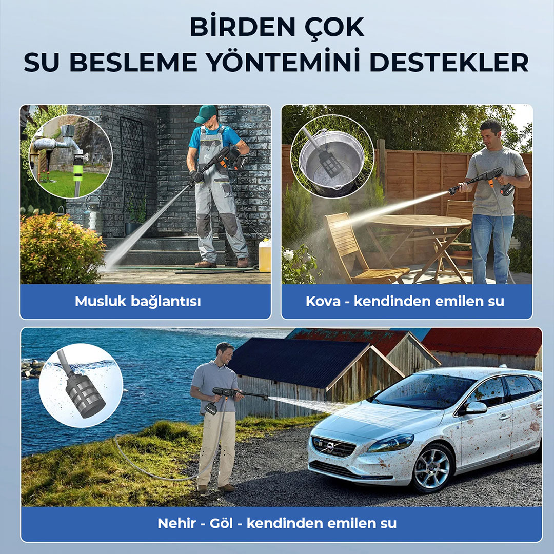 Daha uzun süre kullanmanız için yenilenmiş yüksek kapasiteli büyük boy pil ile gelmektedir. Kolay kullanım Sadece bir kova suya yada hortuma bağlayın ister arabanızı yıkayın ister çiçeklerinizi sulayın ister zeminde oluşan kirleri temizleyin sadece bir tuşa basarak bunların hepsini yapabilirsiniz.