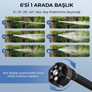 Mükemmel işçilik 2 ayrı uç biri 0 derece, diğeri 40 derece püskürtme açısı sunar ve başlıkları değiştirilmesi gayet kolaydır. Şarj edilebilir pil kablosuz kullanım sağlamak için 5600mAh şarj edilebilir güçlü pili vardır.