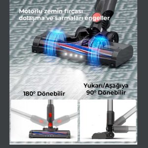 Sıradan süpürgeler gibi yüzeysel temizlik yapmaz! Motorlu zemin fırçası ve güçlü emiş gücüyle tozları, saçları ve derinlerdeki kirleri bile tamamen yok eder.