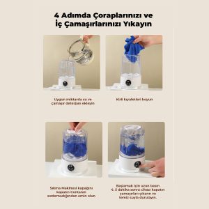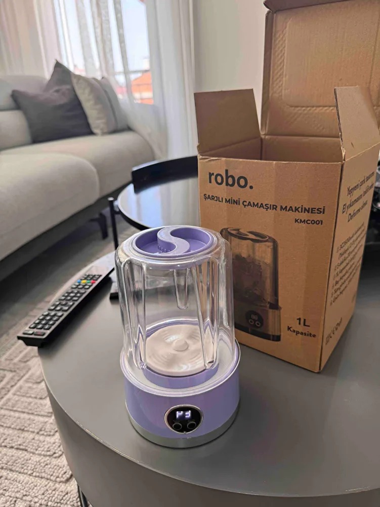 Evinizde, kamp, seyahat ya da öğrenci evinde çamaşır derdine son! robo Şarjlı Taşınabilir Çamaşır Makinesi, kompakt tasarımı, kablosuz kullanımı ve güçlü motoruyla küçük çamaşırları elde yıkamaya gerek kalmadan derinlemesine temizler.