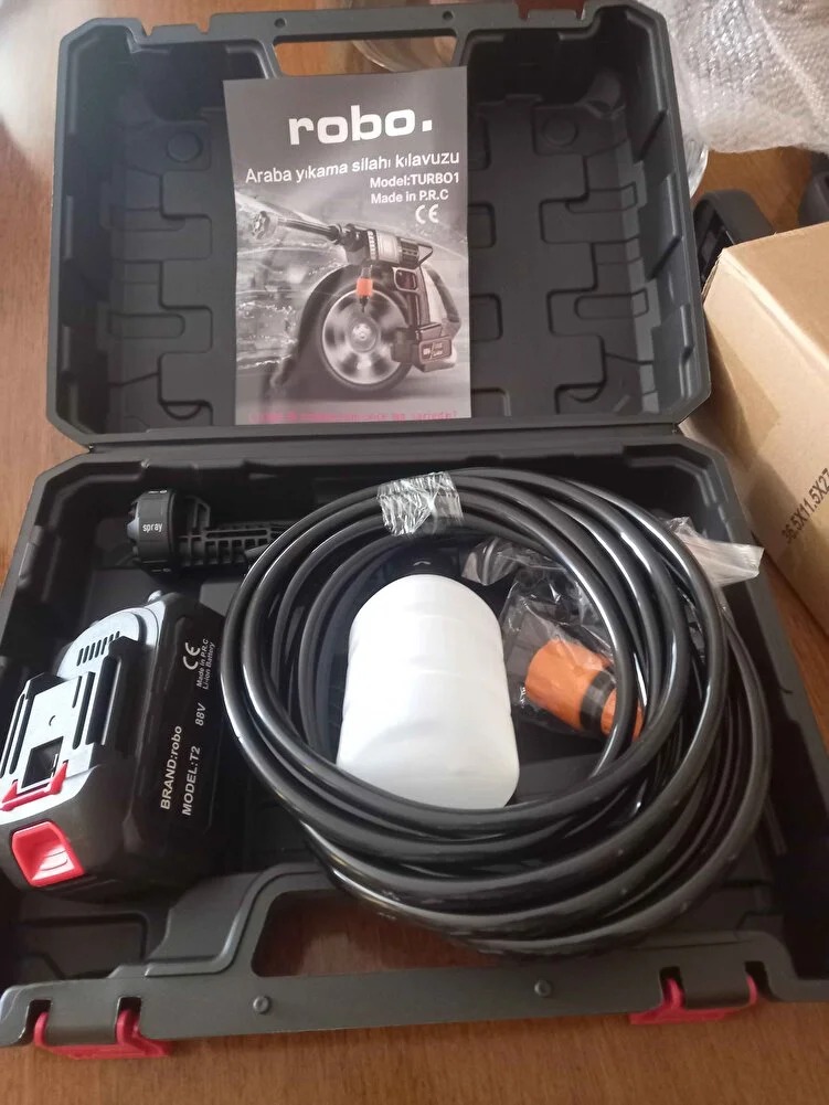 Ürün elime ulaştı sağlam geldi bugün denedim gayet güzel performans ürün sağlam bir şekilde elime ulaştı teşekkür ler robo sadece bana gelen su hortumu sert plastik geldi araba yıkarken sürekli olarak 19 lt lik bidon içinde ters dönüyor ve suyun üstünde kalıyor hortumu daha yumuşak malzemeden yapılsa daha iyi olur onun dışında gayet güzel ve kullanışlı ürün. Teşekkürler