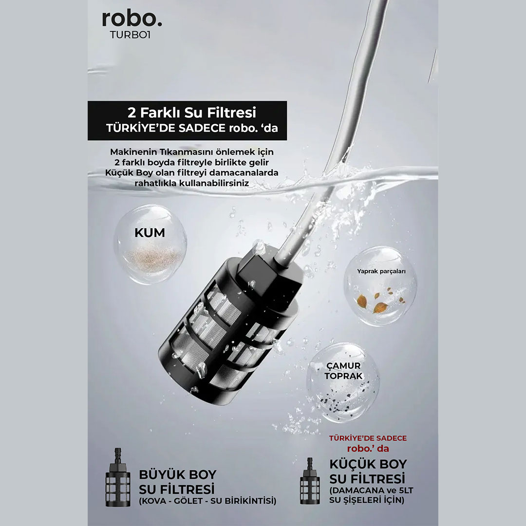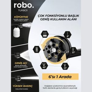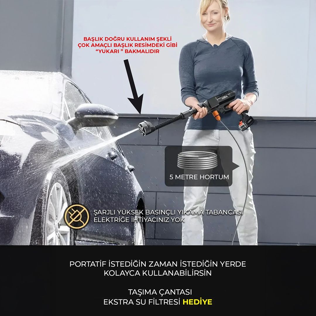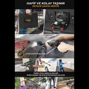 robo Turbo 1 basınçlı şarjlı araç yıkama ve sulama makinesi ile ister araçlarınızı yıkayın ister balkon ya da bahçenizde sizi zorlayan alanları temizleyin. Çit, Korkuluk, Zorlu zeminler, Çatı gibi yüksek alanlar ve daha bir çok alanda etkili kullanım sunar.