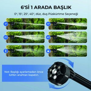 6 Değişik püskürtme imkanı sunan otomatik başlık sizi nozul çıkart tak derdinden kurtarıyor.